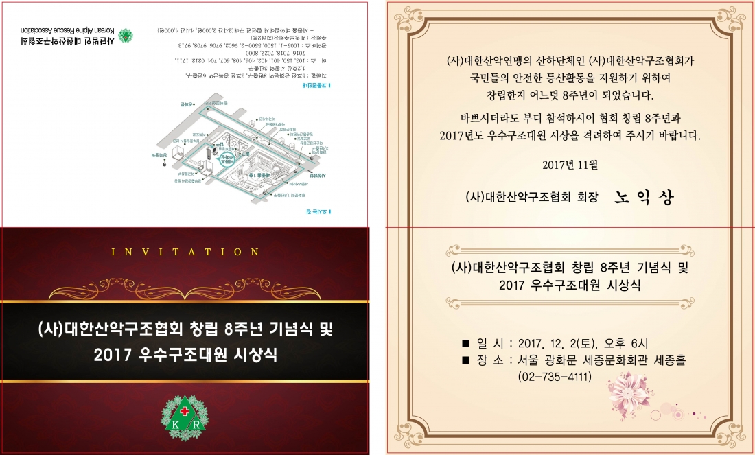 1. 우리협회에서는「창립 8주년 기념식 및 2017년도 우수구조대원 시상식」을 12. 2(토), 오후 6시, 서울 광화문 세종문화회관 세종홀에서 개최합니다.